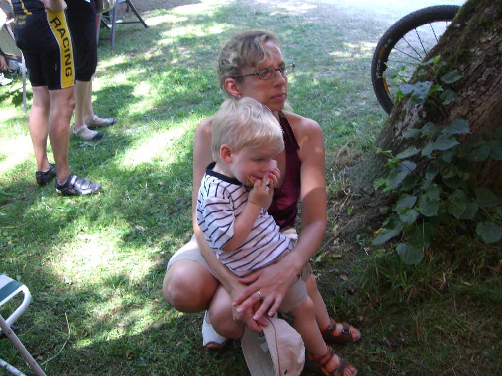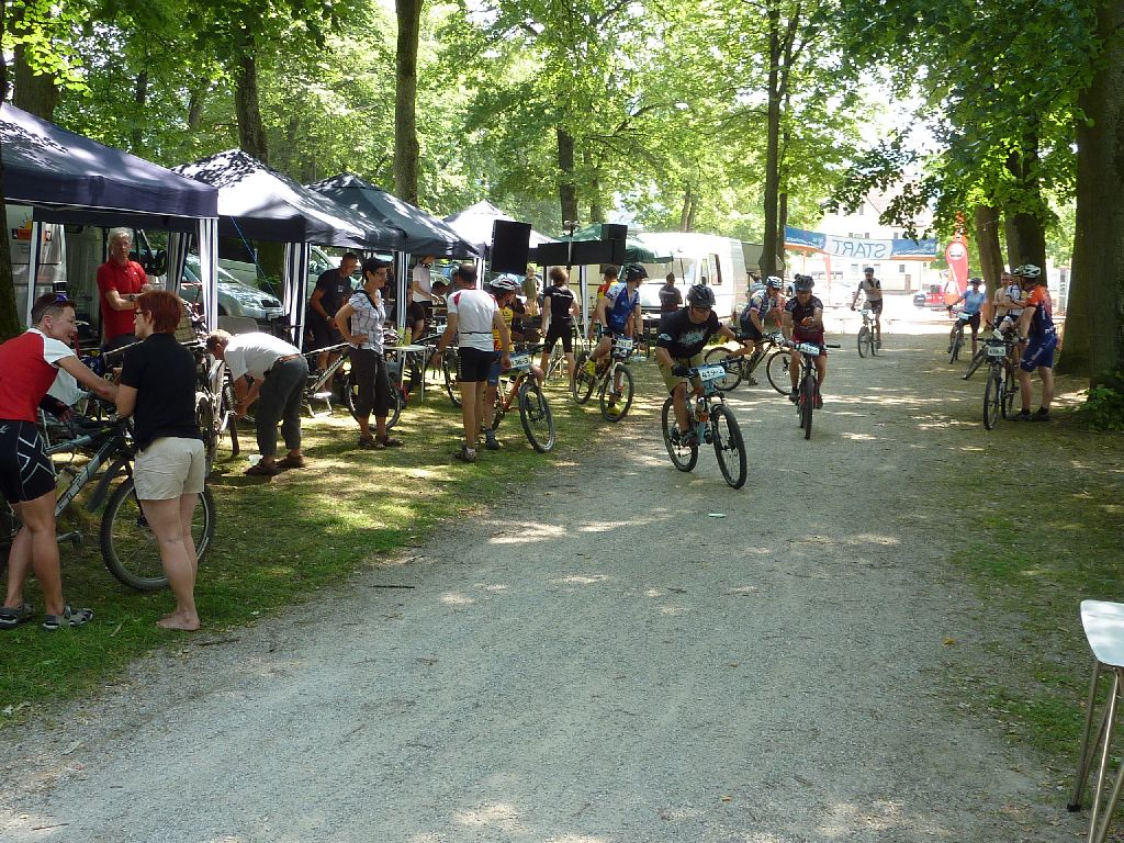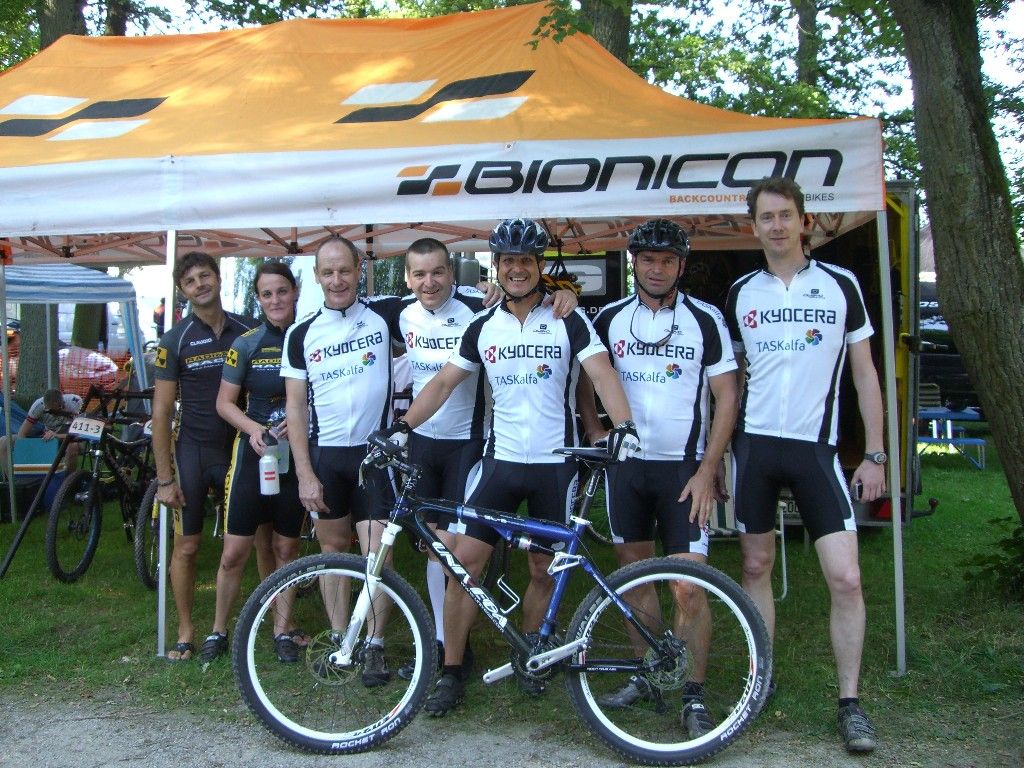 KYOCERA hatte uns für 2010 neue Trikots und Hosen spendiert im Rahmen der Einführung unserer neuen TASKalfa Produktreihe von daher waren wir auch in der Pflicht damit etwas werbewirksames anzustellen. Hierzu kam das 12h-MTB-Rennen meines Heimatvereins RC Schnaittachtal genau richtig. Dank der Unterstützung von Claudio Seitz und Caro Maul vom Bikeshop RADioAKTIV aus Pegnitz konnten wir ein 4er-Mixed und 4er-Herren Team melden. Die Teams im einzelnen: Adi Schneider, Dennis Kunz, Hermann Lukatsch & Jürgen Weimann => Start.Nr. 425 Armin Güntner, Thomas Hessler, Caro Maul, Claudio Seitz => Start.Nr. 411 Das Wetter meinte es diesmal wieder sehr gut mit uns....fast zu gut.....denn 40 Grad und Sonne pur kosten viel Kraft. Pünktlich um 9.00 Uhr gingen rund 90 Teams mit Ihren ca. 200 Fahrern auf die 6km langen und mit 90hm ausgestattete Runde mit dem Ziel in 12 Stunden so viele wie möglich davon zu fahren. Eigentlich ganz einfach aber aufgrund der enormen Hitze, war das schon eine Herausforderung. Unsere Strategie sah nach jeder Runde einen Wechsel vor - was auch bei den Außentemperaturen von rund 39 Grad ab Mittag enorm wichtig war. Während das Mixed-Team konstant, defekt- und sturzfrei seine Runden zog, wurden die Herren von Kettenklemmern und Stürzen heimgesucht - so daß die Jungs nach der Halbzeit nur noch zu Dritt unterwegs waren. Sie kämpften sich aber wacker bis zum Ende und schafften ein tolles Ergebnis..... Teamgeist ist das Stichwort. Dank physiotherapeutischer Hilfe von Andrea Mester aus Pegnitz konnten wir bis auf Dennis alle das Rennen zu Ende bringen. Es war hart, zeitweise qualvoll aber macht dennoch Lust auf eine Wiederholung in 2011.... Erwähnenswert bleibt aber auch die geniale Strecke von Ferdl und die lückenlos perfekte Organisation und vor allem die leckere Verpflegung. Für das Team von KYOBike war es das erste Rennen dieser Art, setzt aber die Meßlatte für andere Veranstalter sehr hoch. Die Rundenzeiten und Bilder finden unsere Starter hier unten: